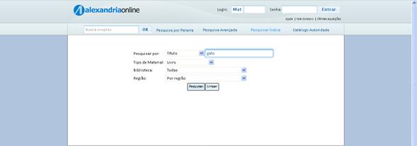 eleger o campo em que deseja fazer a busca (Título, Autor, Assunto, Editora, Coleção/Série Idioma, Registro,