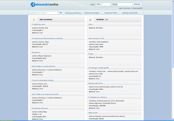 primeira tela do OPAC são exibidos os títulos mais consultados (coluna da